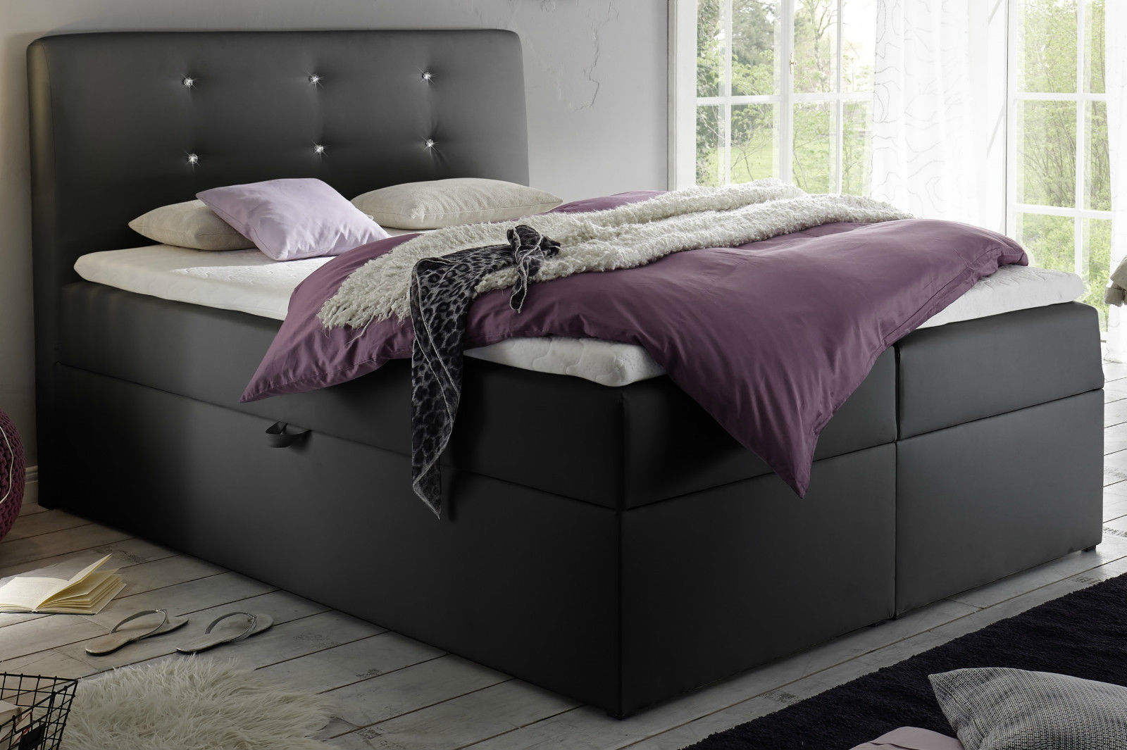 Boxspringbett Schlafzimmerbett MONZA mit Dekorsteinen Kunstleder Schwarz 160x200 cm