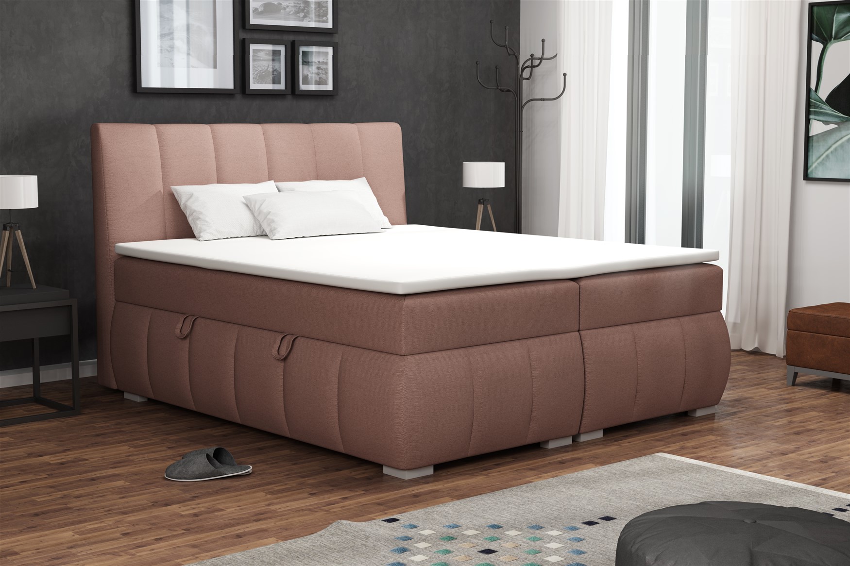 Das extravagante Boxspringbett Vincenza besticht durch das ausgefallene Design. Die Bettkästen sind gepolstert und mit markanten Rundungen versehen, was dem Boxspringbett Einzigartigkeit und Luxuriösität verleiht. Der Topper aus Kaltschaum passt sich dem Körper an und sorgt dadurch für einen hohen Schlafkomfort. Außerdem bietet das Boxspringbett ausreichend Stauraum für alltägliche und nicht alltägliche Dinge. Das eingebaute Liftsystem ermöglicht ein kinderleichtes Aufklappen der beiden Bettkästen.
