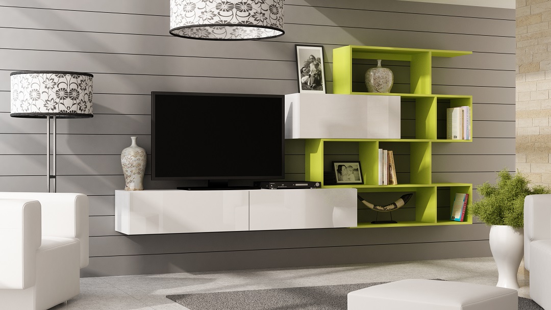 - 1 x Mediawand - SKY - Weiß Hochglanz / Regal: Limette