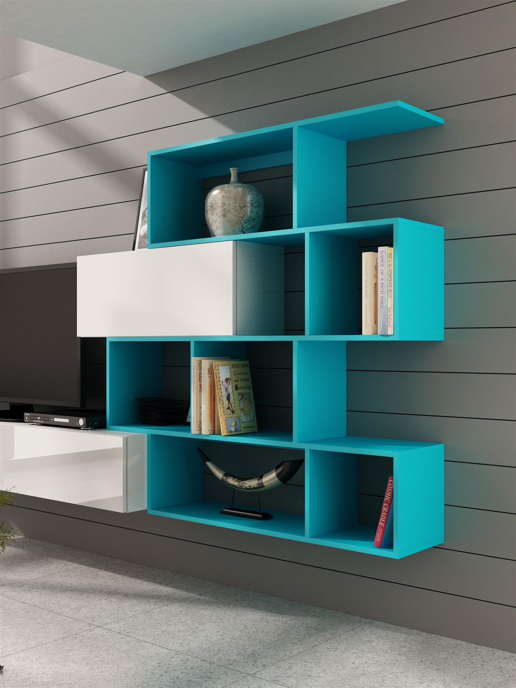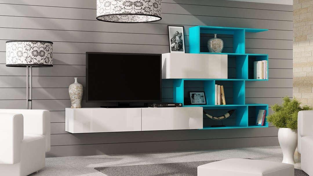 - 1 x Mediawand - SKY - Weiß Hochglanz / Regal: Petrol