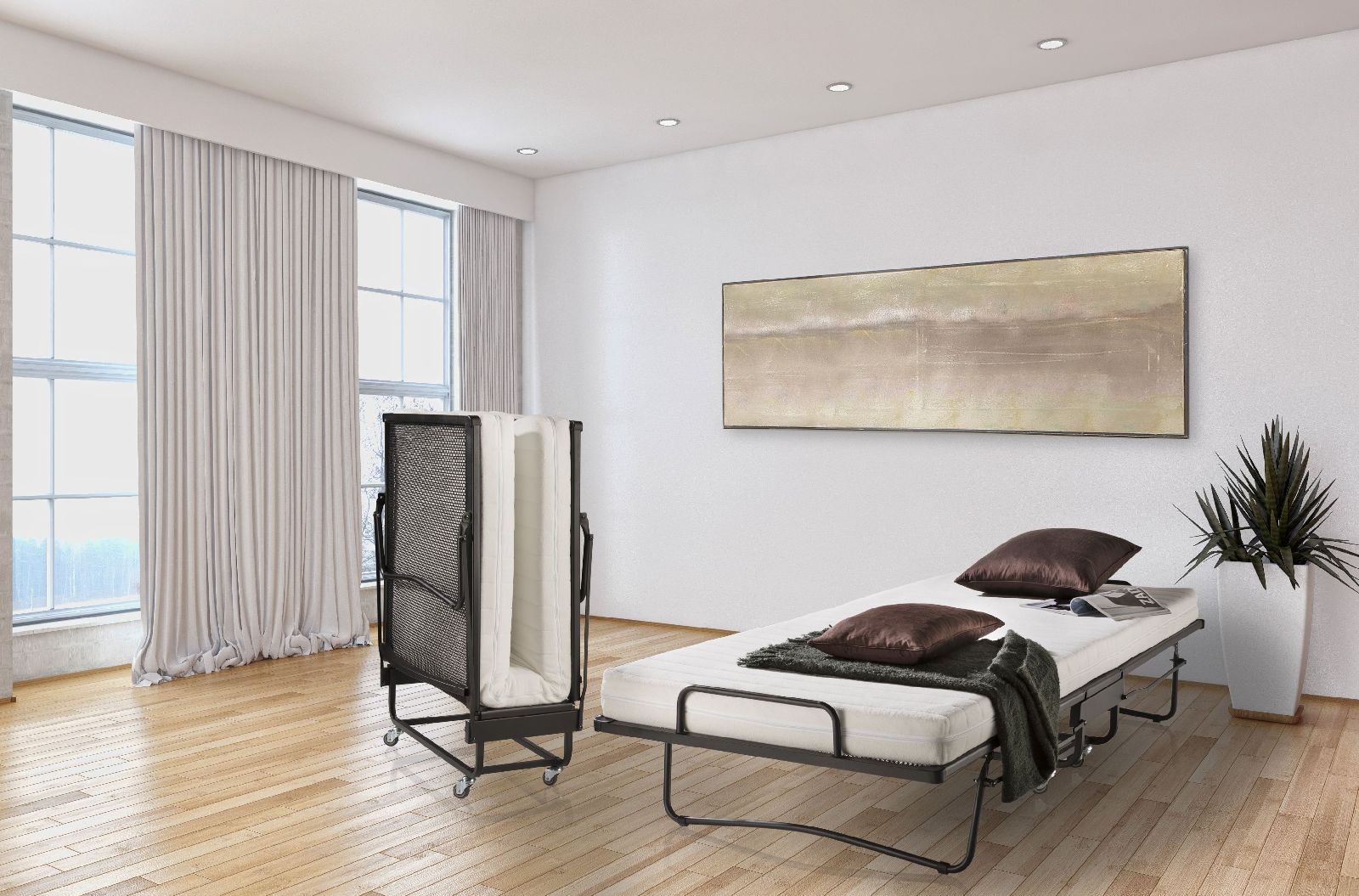 Das Raumsparbett -SLEEPERS 4 - ist die ideale Lösung, wenn Sie Besuch erwarten. Aufgrund der Klappautomatik ist das Bett mit einen paar Handgriffen aufgestellt und mit einer Liegefläche von 90 x 197 cm einsatzbereit. Besonders der ergonomisch geformte Spiralnetzrahmen sorgt für eine optimale Unterfederung. Platzsparend zusammengeklappt (Maße B/H/T 91 x 114 x 47 cm) kann es nach dem Gebrauch problemlos mittels den hochwertigen, kugelgelagerten Vollgummileichtlaufrollen wieder verstaut werden.